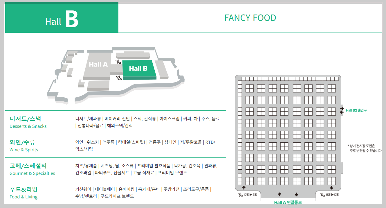 제가 관심있는 주류 전시는 Hall B에서 진행됩니다. 와인, 위스키, 맥주, 칵테일, 전통주, 샴페인, 저/무알코올, RTD/믹스/시럽(하이볼을 뜻하는 거겠죠?) 등 다양한 분야의 주류가 전시될 예정인데요.