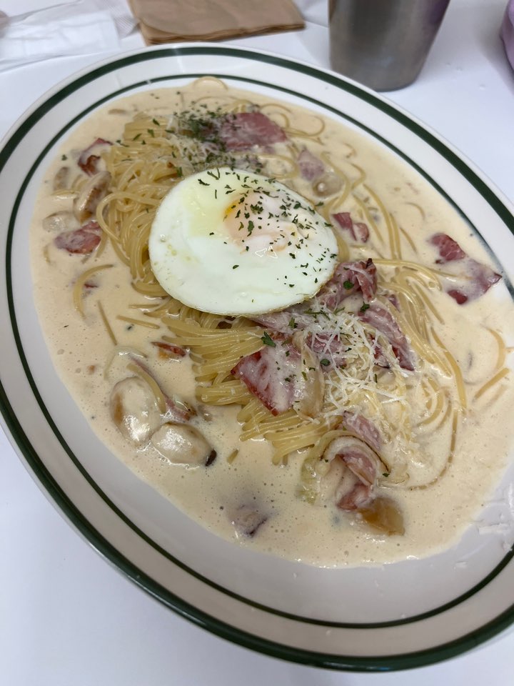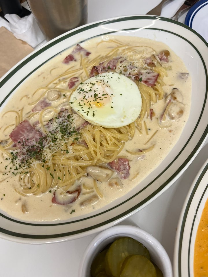 쉬림프 로제 리조또와 까르보나라입니다. 리조또에도 새우가 다섯 개나 들어있었고 까르보나라에 베이컨이 정말 수북이 들어있어요. 정말 죽전 파스타 가성비 맛집답습니다. 파스타 전문점이라 그런지 리조또보다는 파스타가 맛있네요.
