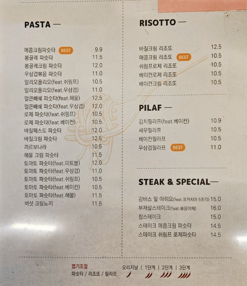 파스타 전문점인만큼 파스타 종류가 아주 다양합니다. 리조또, 필라프, 스테이크도 있어서 선택지가 많아요. 또한 사진에는 없지만 세트메뉴가 있는데 여럿이 방문했을 때에는 세트 메뉴가 좋습니다.