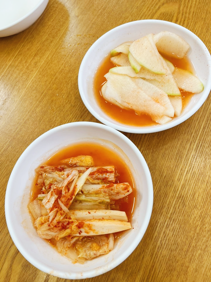 제일 먼저 김치가 나왔어요. 간이 세지 않고 새콤한 배추김치와 무김치입니다. 슴슴한 평양냉면이랑 먹기 좋아요.