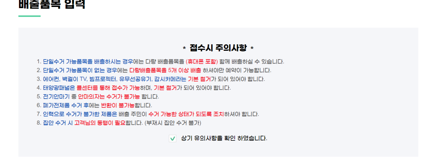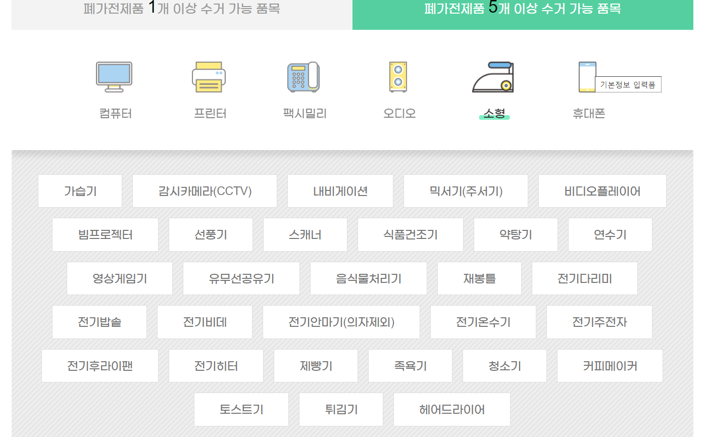 냉장고, 세탁기, 에어컨, TV 처럼 대형가전의 경우는 한개만 있어도 수거를 해주시는데, 소형가전의 경우는 5개 이상 배출시에만 수거가 가능합니다. 또한 수거가 되지 않는 제품들이 있을 수 있으니 (ex. 안마의자, 유축기 등) 잘 확인하고 신청하셔야겠습니다.