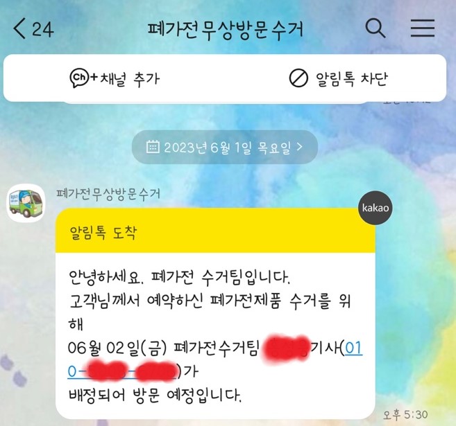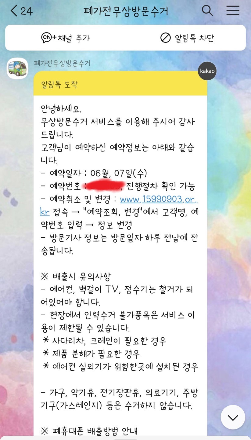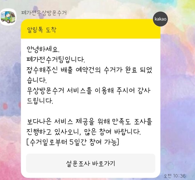 다음날 오전 약속한 시간이 되자 정말 정확히 기사님이 방문하셨어요. 번개같이 수거를 해가시고는 바로 톡이 옵니다.