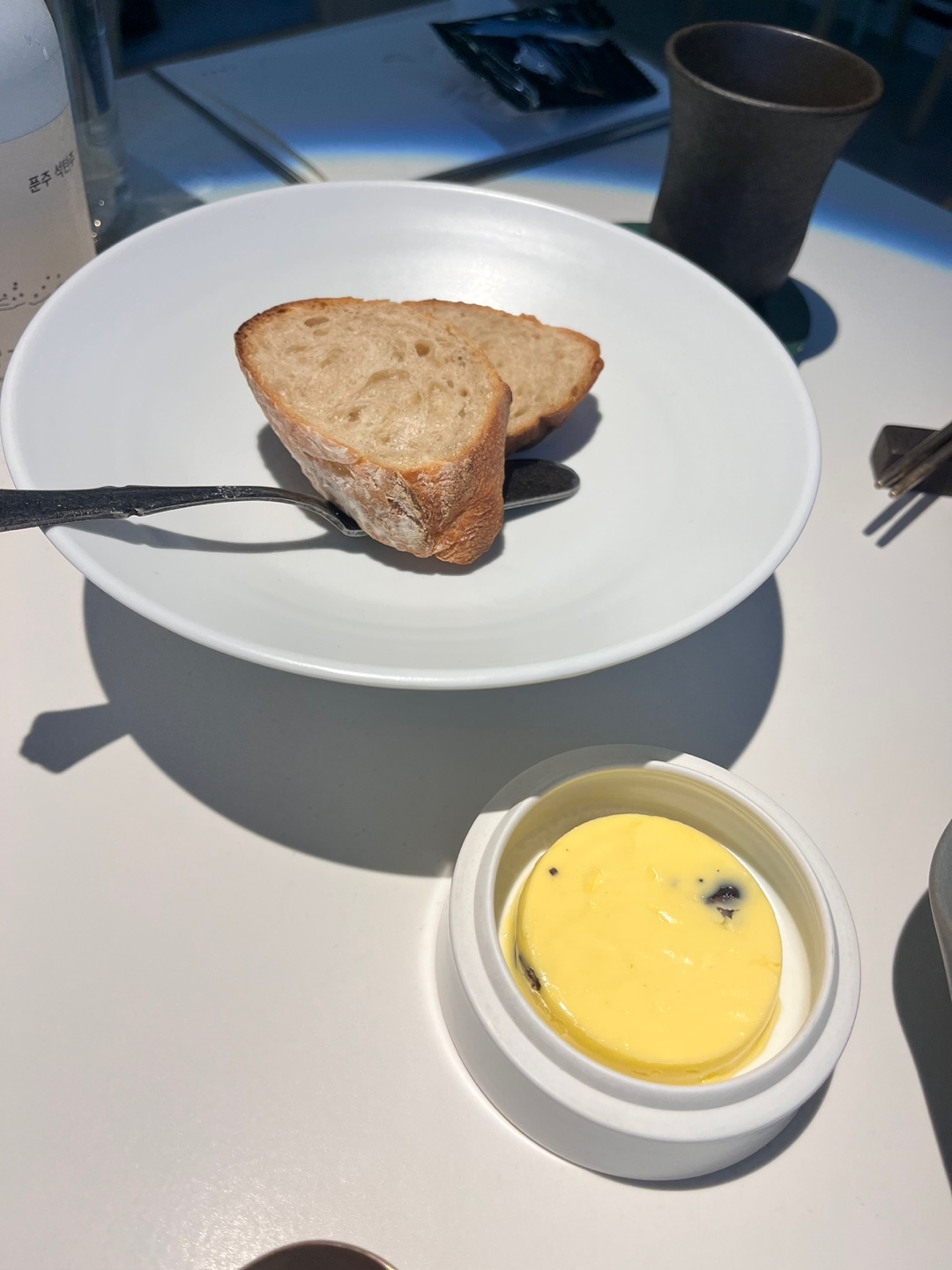 막걸리로 만든 바게트와 부드러운 버터가 제공됩니다.