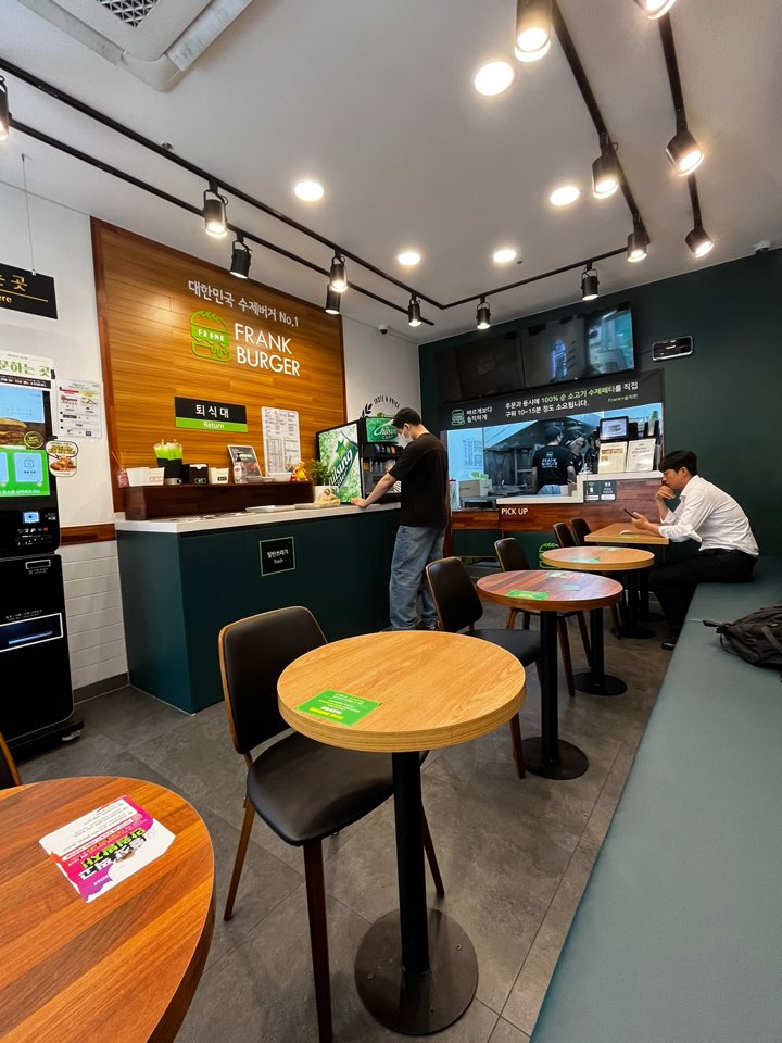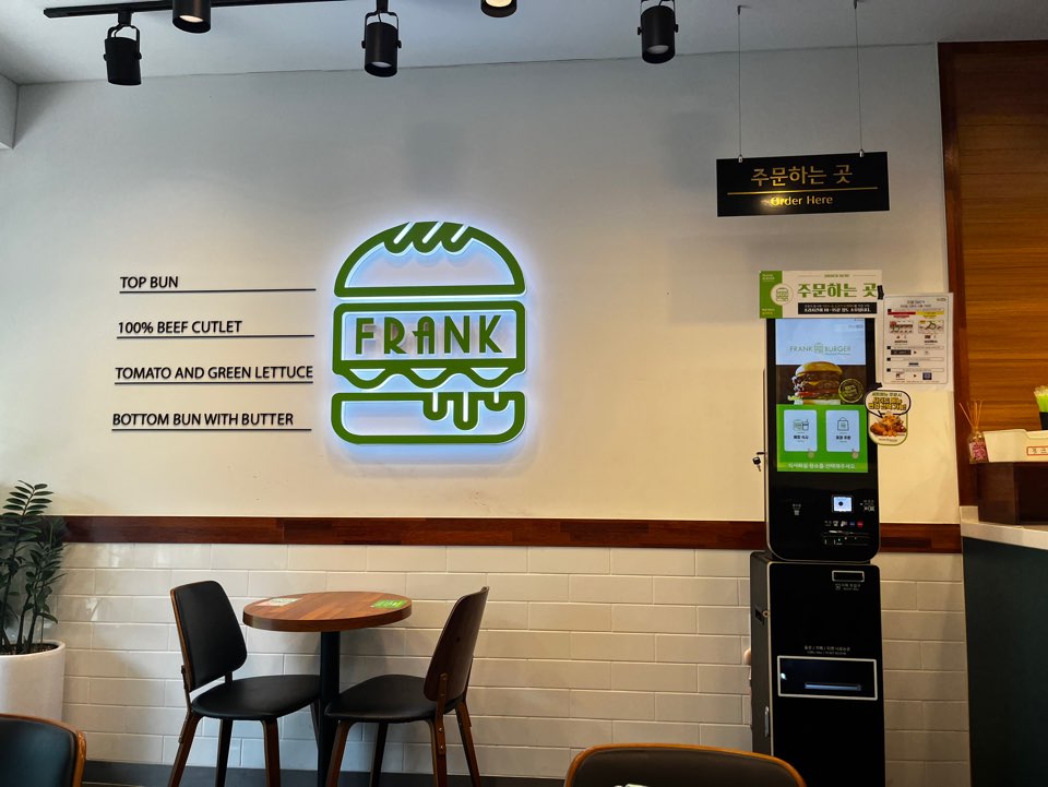 제가 방문한 곳은 분당 미금역 7번 출구에 위치한 프랭크버거 분당미금역점입니다. 매일 아침 9시부터 밤 11시까지 운영되고 있습니다. 키오스크로 주문을 할 수 있어요. 테이블은 4인용 두개, 2인용 다섯 개가 있습니다.