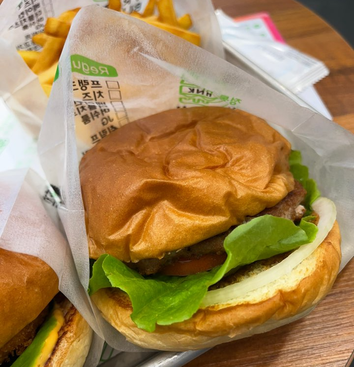 프랭크버거의 특징중 하나는 버거 사이즈를 선택할 수 있다는 것입니다. 남성분들 중에 버거 하나가 부족한 분들 많이 계실 텐데 라지사이즈를 주문할 수 있어 좋을 것 같아요. 저희는 SG불고기버거(R), 쉬림프버거(R), 프렌치프라이를 시켰어요. 버거 먹으러 오기 전에 구매했던 음료가 있어서 음료는 따로 주문하지 않았습니다.