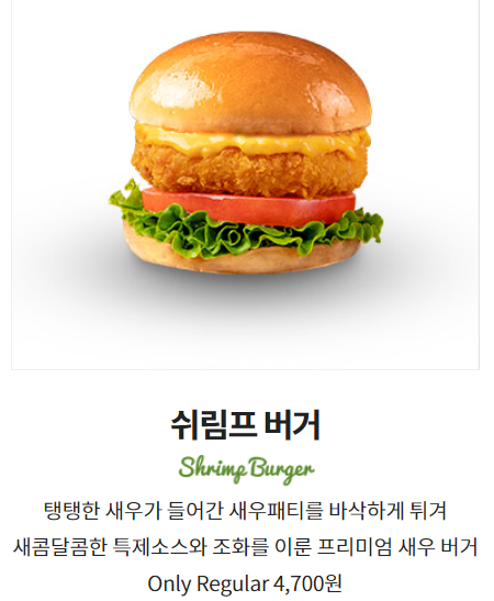 새우 패티가 정말 맛있네요. 소스도 부족하지 않게 들어있었고 토마토 슬라이스가 들어가있는 것이 좋았습니다. 쉬림프버거는 버거 중에 유일하게 단일 사이즈예요. 쉬림프버거를 애정하는 사람으로서 쉬림프버거도 라지사이즈 도입이 필요하다고 생각합니다.