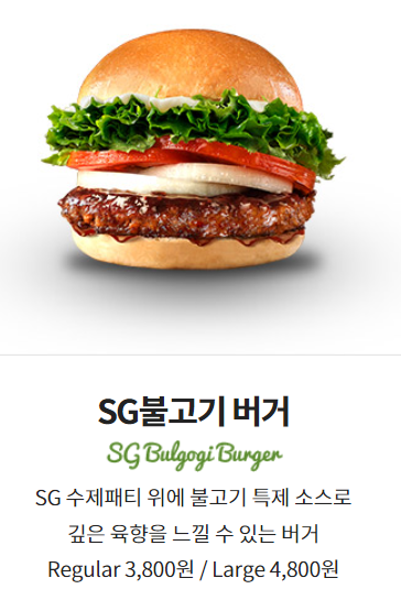 다음은 프랭크버거의 SG불고기버거입니다. 수제패티위에 불고기 특제 소스로 깊은 육향을 느낄 수 있는 버거라고 적혀있는데요. 육향이 정말 고소하고 소스도 우리가 익히 아는 불고기 버거 소스인데 재료가 아주 신선했습니다. 양파와 토마토슬라이스도 잘 어울렸어요. 레귤러 사이즈가 3,800원이면 정말 가성비 좋은 수제버거라고 생각합니다. 또 갈 거예요!