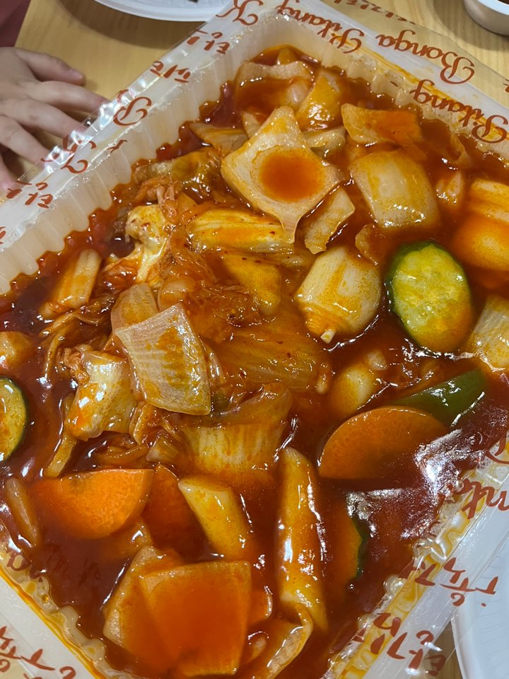 포장을 해왔어요. 김피탕과 피클, 음료수가 함께 제공됩니다. 2인짜리를 주문했는데 사진에서는 가늠이 잘 안 되지만 양이 정말 많아요. 아래쪽에 치즈가 덮인 탕수육이 깔려있고 위쪽에 야채와 소스가 넉넉하게 담겨있습니다.