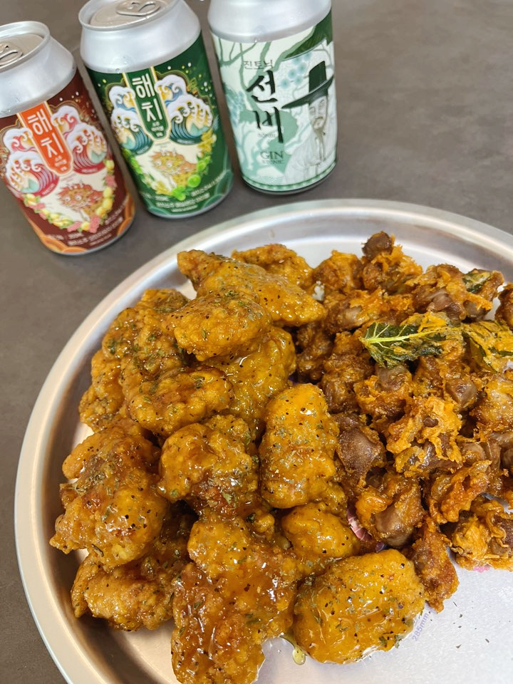 함께한 안주는 또봉이통닭의 신메뉴인 빠다후추순살 치킨입니다. 유튜브에서 자주 보이길래 시켜봤어요! 달큰하고 오일리한데 후추가 잔뜩 뿌려져 있어서 느끼함을 잘 잡아주네요. 많이 맵지는 않아요.