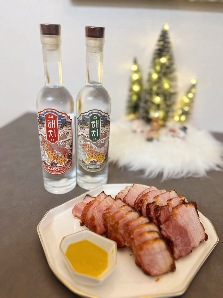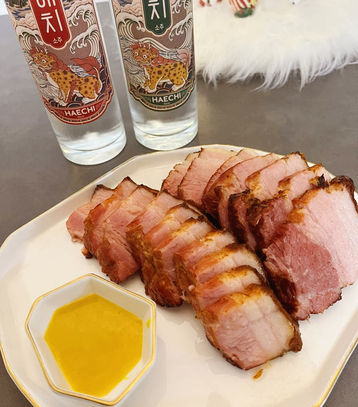 해치 소주가 고기류와 잘 어울린다기에 준비해 본 음식은 트레이더스의 bbq 훈제 삼겹살입니다. 먹기 전에 간단히 에어프라이어에 돌려주고 예쁘게 플레이팅 해주면 돼서 아주 편리하답니다. 허브향과 훈연향이 은은하게 나면서 겉은 바삭하고 속은 촉촉하고 부드러워서 정말 맛있습니다. 머스터드에 찍어먹으니 좋네요. 양이 어마무시해서 두세 번에 나눠 먹었어요.