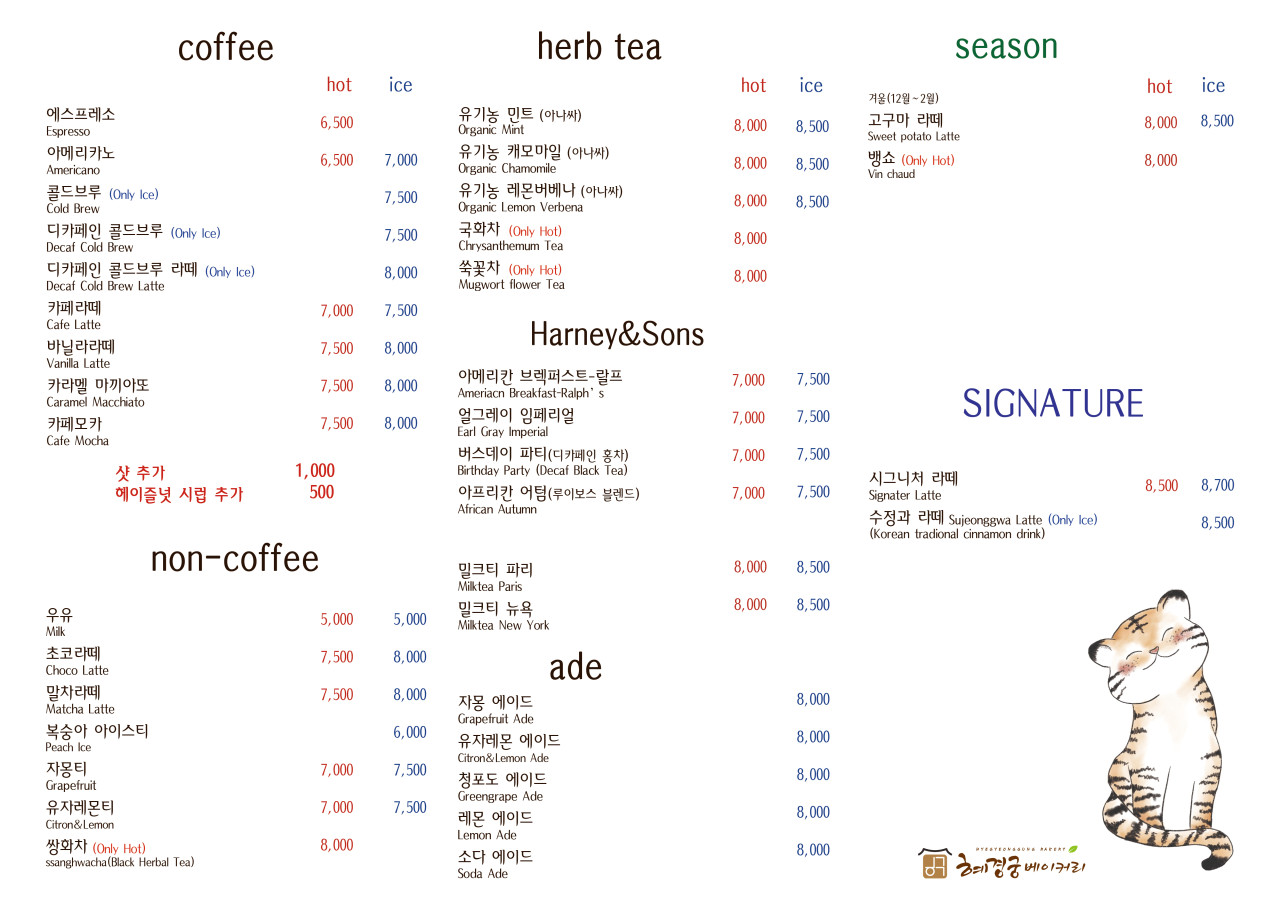 음료 메뉴도 가격대가 꽤 있는 편이에요. 저희는 라테와 천혜향 주스를 시켜 보았습니다. 라테가 고소하고 진해서 맛있더라고요. 천혜향 주스는 100% 착즙 주스라 그런지 살짝 씁쓸했지만 건강한 맛으로 먹기 좋았어요.
