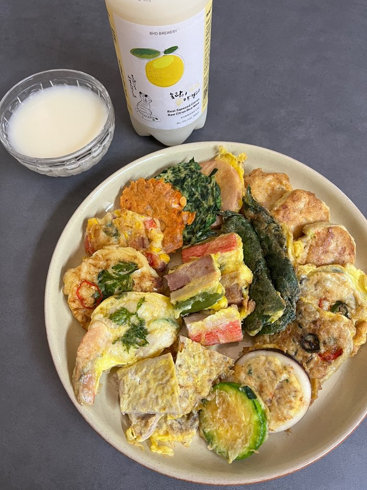 모듬전이랑 상큼한 호랑이 유자 생막걸리 조합이 아주 훌륭하네요. 모듬전은 마포 공덕역 공덕시장에 있는 마포 청학동 부침개라는 곳에서 구매했어요. 먹고 싶은 전을 직접 바구니에 담으면 무게를 재서 가격을 측정해요. 사진에 보이는 전에다가 육전 1장까지 더해서 25,000원 정도였는데요. 세어보니 총 12가지네요. 너무 괜찮죠? 청학도 부침개 장소 리뷰도 조만간 해볼게요!