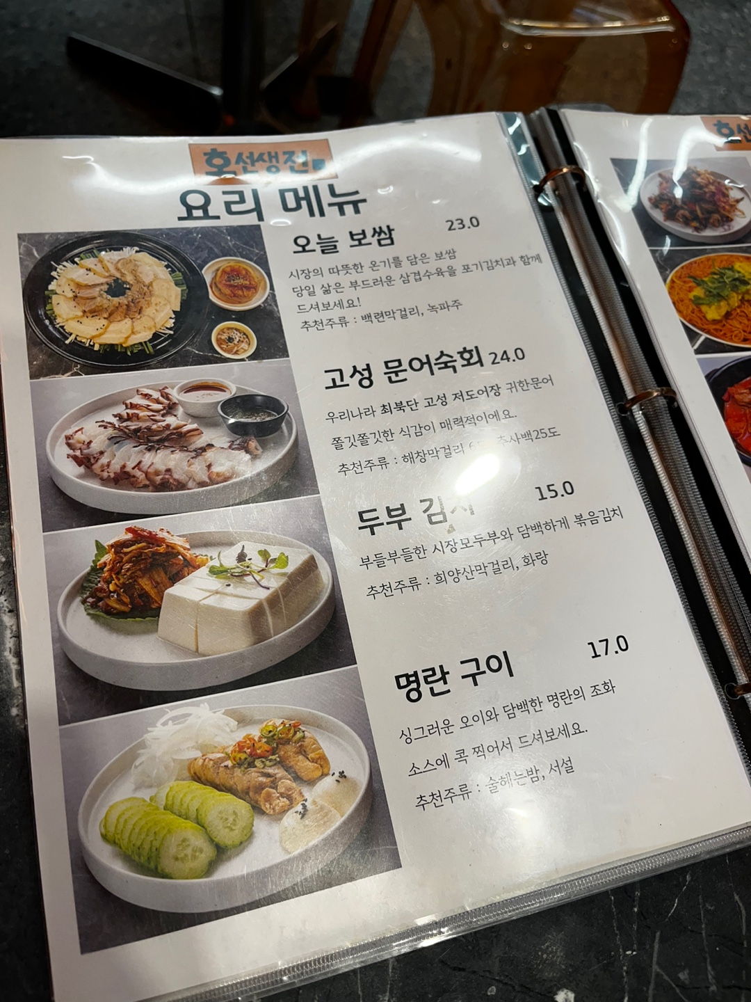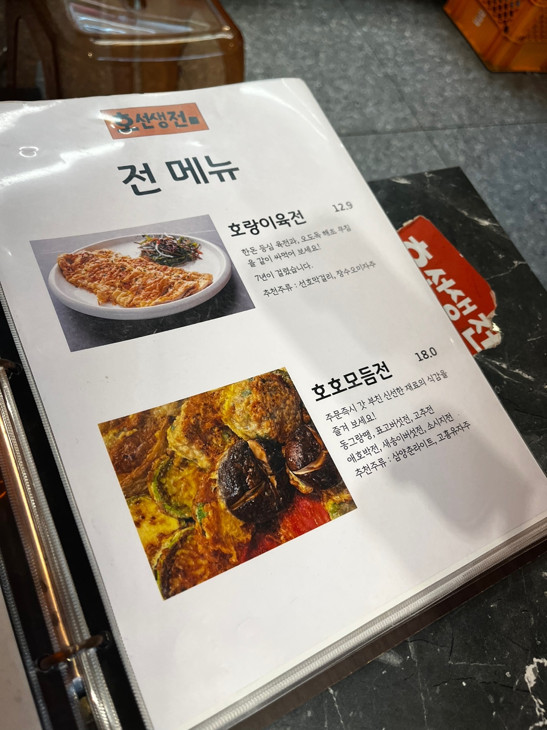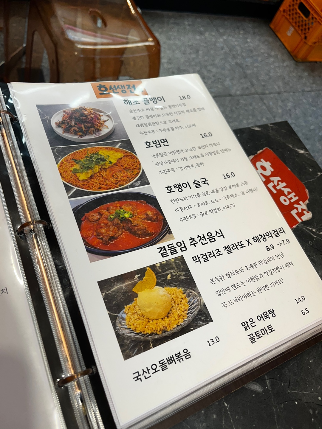 호빔면이 가장 유명한 것 같은데 1차에서 면을 먹고 와서 호랑이육전, 오돌뼈볶음, 해창막걸리 젤라토를 주문했어요!