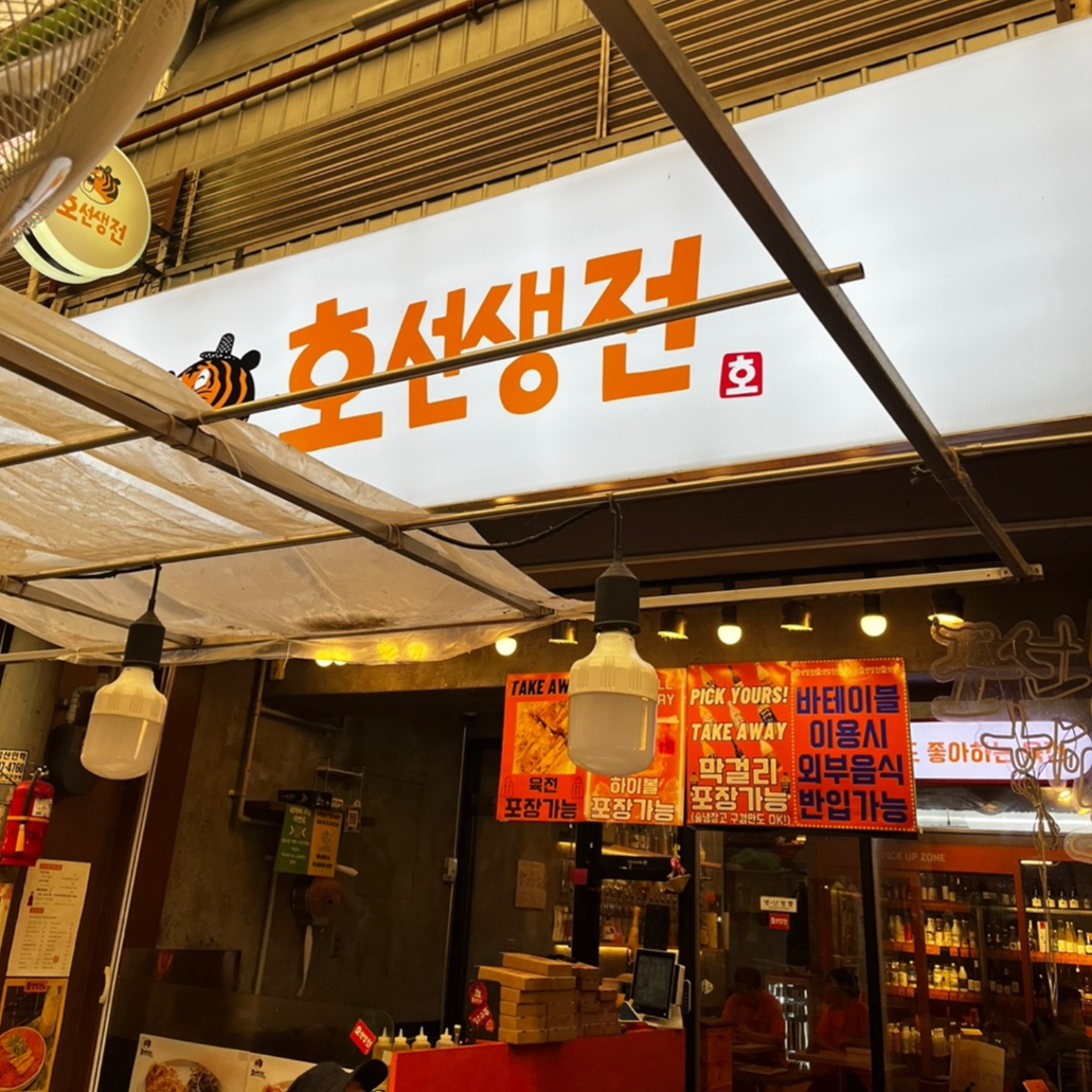 요즘 너무 덥잖아요. 호선생전은 에어컨도 잘 나오고 실내에 전용 화장실까지 있기 때문에 광장시장 내에서 쾌적한 식당을 찾으신다면 강추합니다. 다양한 술과 음식은 기본이고요.