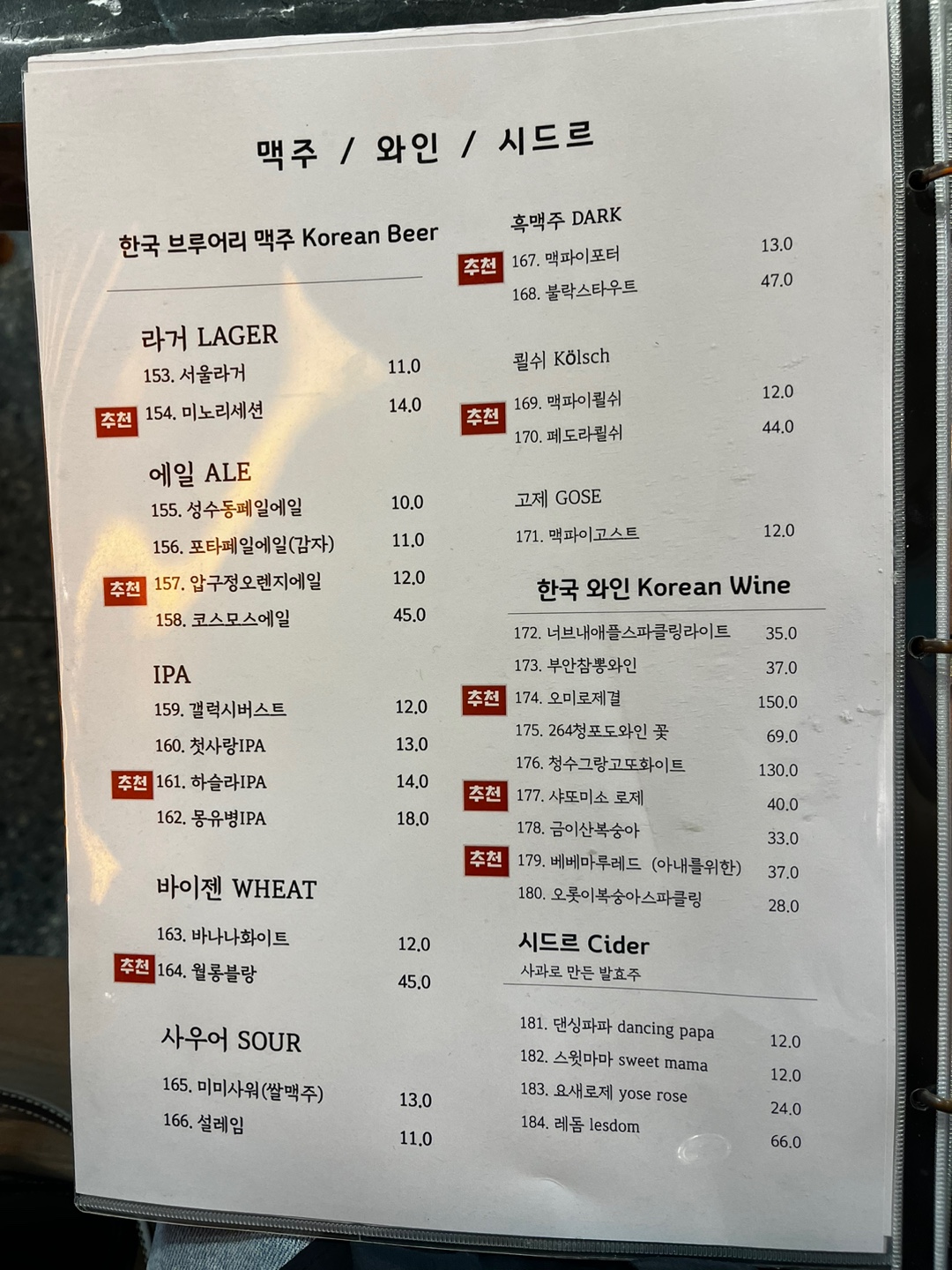 더 놀라운 점은 전통주뿐만 아니라 맥주, 와인, 시드르(cider)까지 있다는 점이에요. 술 좋아하시는 분들에겐 천국이 따로 없는 곳입니다.