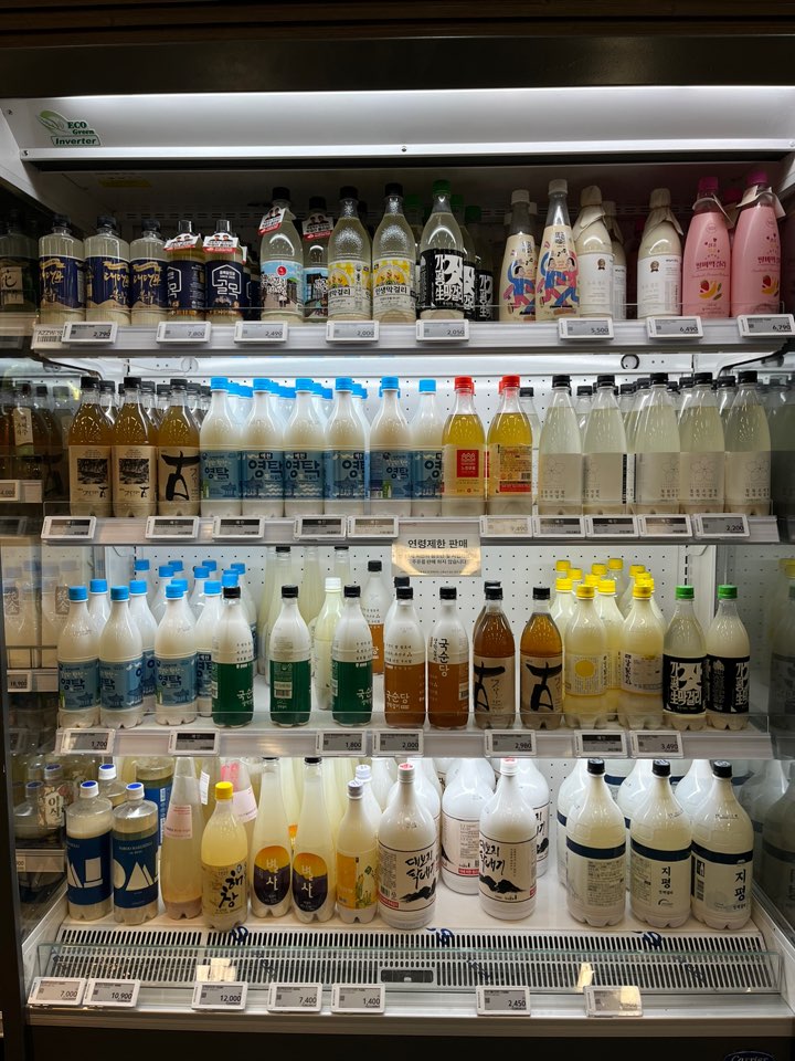 좌측에 상온보관되고 있는 막걸리들은 살균 막걸리이고 우측에 냉장고 안에 들어있는 막걸리들은 생막걸리입니다. 한눈에 보기에도 가짓수가 엄청 많지요?