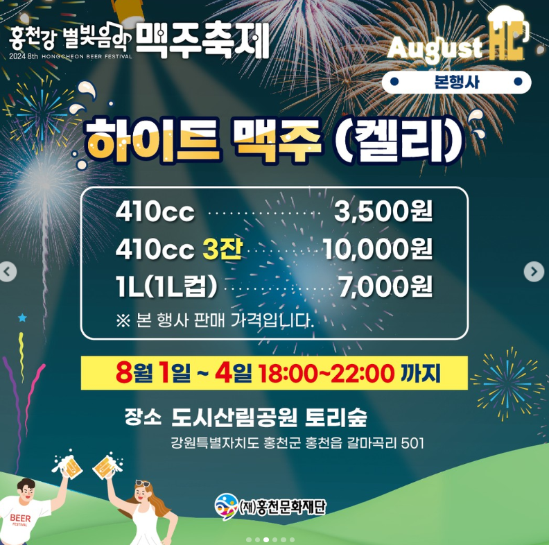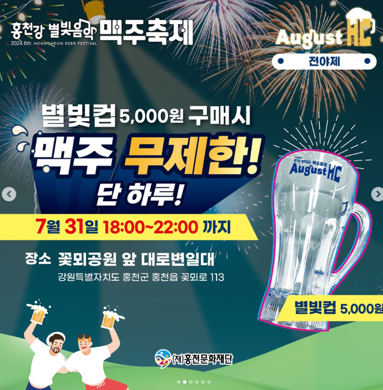 오늘부터 5일간 홍천에서 홍천강 별빛음악 맥주축제가 열리는데요. 전국 최대 규모의 맥주공장인 하이트 강원공장에서 갓 생산한 캘리 생맥주와 홍천군의 수제맥주들을 맛보며 다양한 공연을 즐길 수 있다고 하지요! 지금부터 자세히 알아볼까요?
