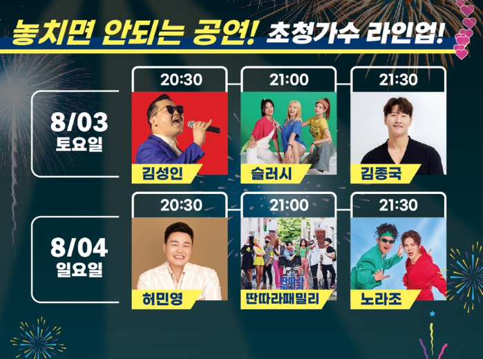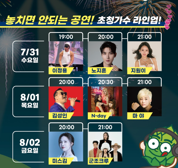 초청가수 라인업입니다. 전야제 날에는 이정용, 노지훈, 지원이님 공연이 예정되어 있고요. 주말에는 김종국, 노라조의 공연이 특히 기대됩니다.