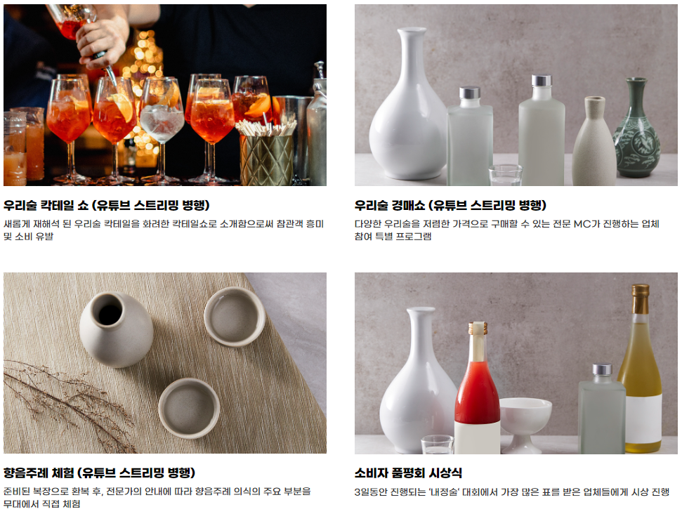우리술 품평회 시상식, 우리술 역량강화 공개 컨설팅, 주류업계 트랜드 세미나, 우리술 푸드 페어링쇼, 우리술 칵테일 쇼, 우리술 경매 쇼, 향음주례 체험, 소비자 품평회 시상식 총 8가지의 무대 프로그램이 진행될 예정입니다.