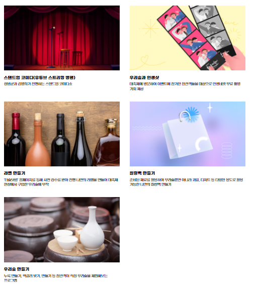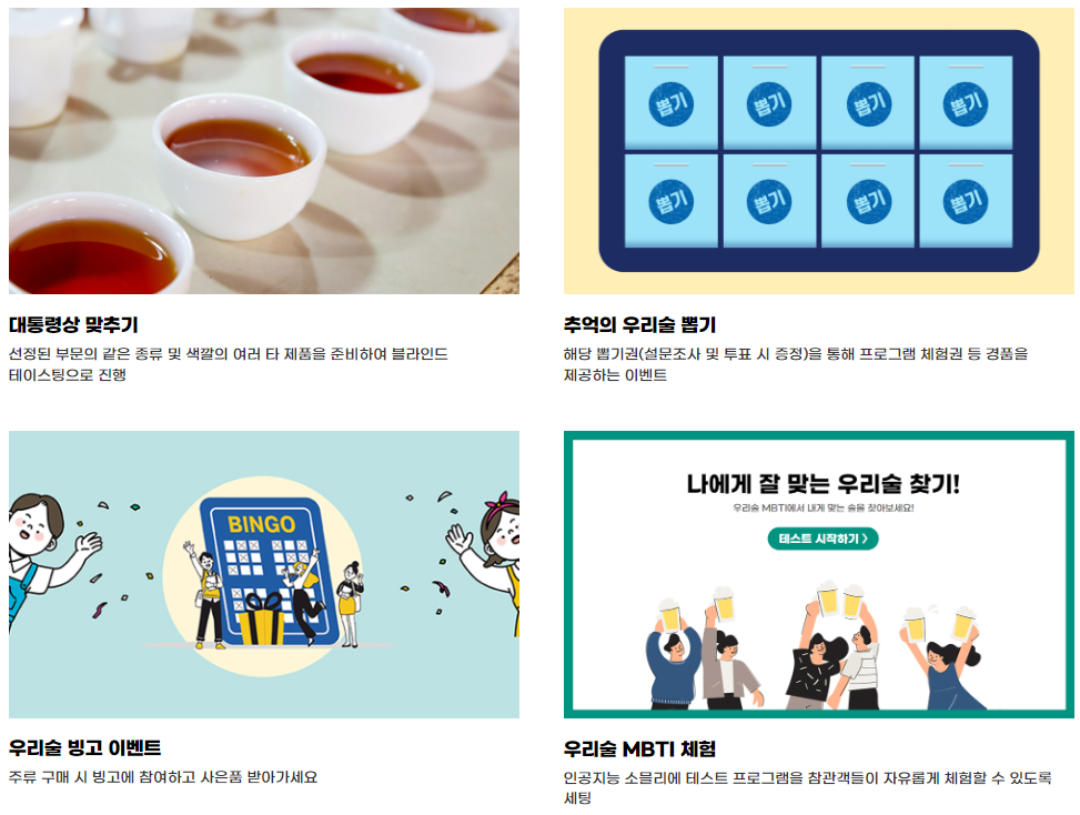 부대 행사로는 대통령상 맞추기 블라인드 테이스팅, 우리술 빙고, 추억의 우리술 뽑기, 우리술 MBTI 체험, 스탠드업 코미디, 우리술과 인증샷, 라벨 만들기, 칠링백 만들기, 우리술 만들기 등이 준비되어 있어요.