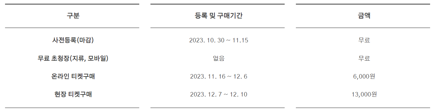 12월 6일까지 온라인 예매처에서 54% 할인된 6,000원에 티켓을 구매하실 수 있습니다. 코엑스 홀 A, C의 로비데스크에서 예약 확인 후 입장 팔찌로 교환하면 됩니다.