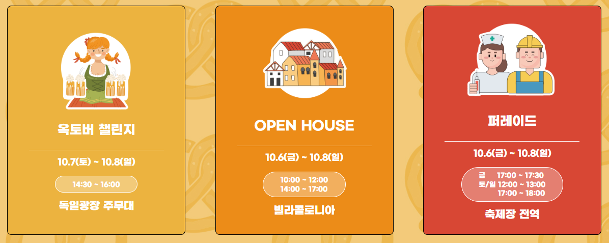 옥토버챌린지, 오픈하우스, 퍼레이드 행사가 있습니다. 옥토버챌린지는 맥주잔 많이 들고 달리는 게임이며 오픈하우스는 파독광부나 파독 간호사의 집을 구경할 수 있는 행사라고 합니다. 독일에서 사용하던 가구들을 그대로 배로 가져왔는데 엔틱한 가구들을 보는 재미가 있겠습니다.