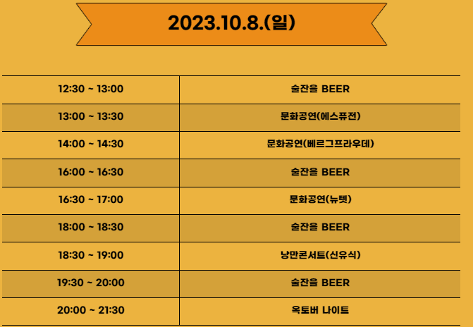 스케줄 사이사이에 배정되어 있는 '술잔을 BEER'라는 프로그램은 맥주 빨리 마시기 대회라고 합니다. 재미있을 것 같아요.