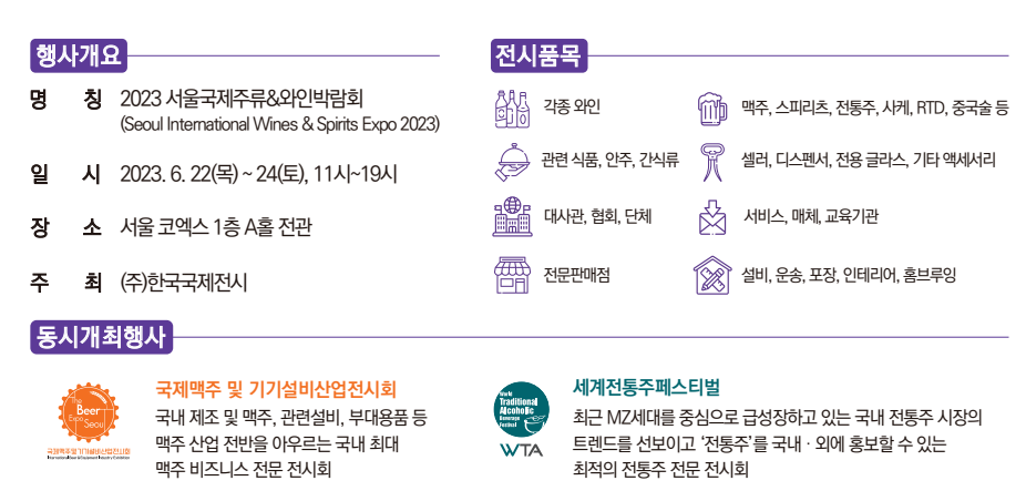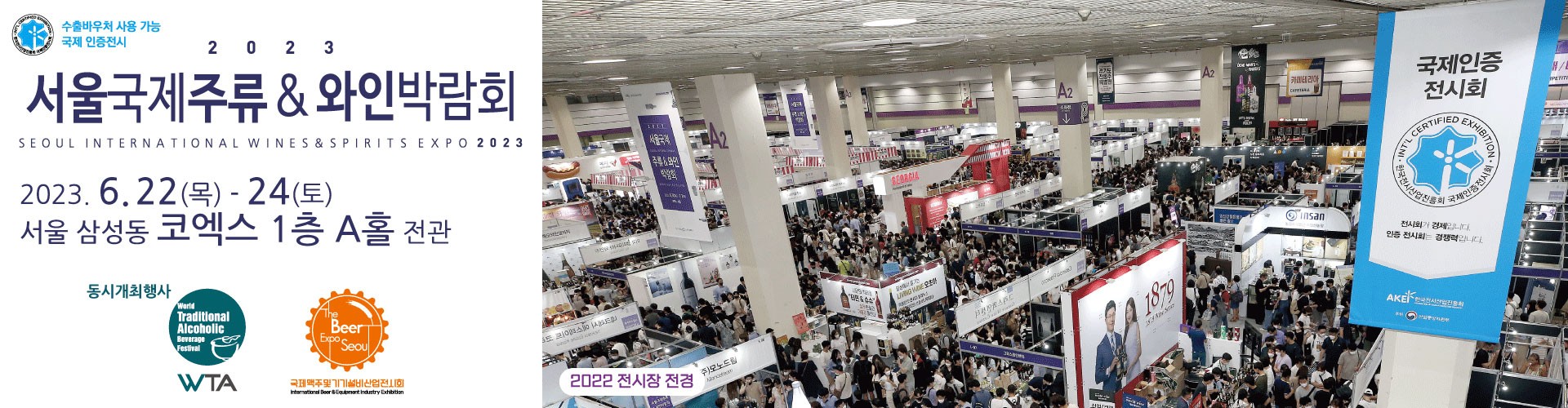 2023. 6. 22(목) ~ 24(토), 코엑스 1층 A홀 전관, 대한민국 최대 규모 종합주류박람회로 주류산업의 트렌드를 선도하고 기업들에게 다양한 홍보 기회를 제공