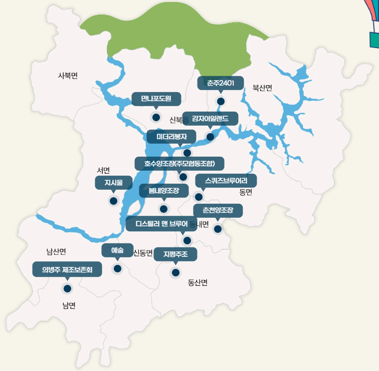 이번 춘천 술 페스타에는 감자아일랜드, 디스틸러앤브루어, 만나포도원, 미더리봉자, 봄내양조장, 스퀴즈맥주, 스퀴즈브루어리, 예술주조, 의병제주보존회, 지시울, 지평주조, 춘주2401, 춘천양조장, 호수양조장 등 춘천의 14개 양조장이 참여합니다.