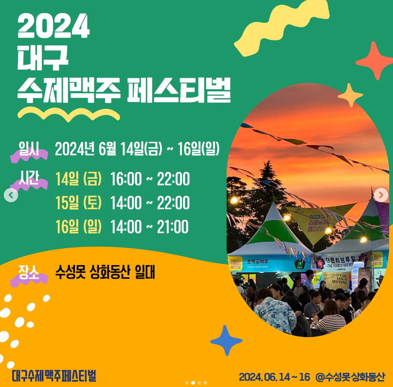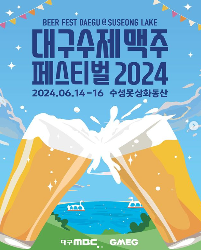 이번주 금요일(14일)부터 일요일(16일)까지 대구 수성못 상화동산 일대에서 2024 대구 수제맥주 페스티벌이 개최됩니다. 금요일은 오후 4시부터 밤 10시까지, 토요일은 오후 2시부터 밤 10시까지, 일요일은 오후 2시부터 밤 9시까지 진행될 예정입니다. 입장료는 무료!