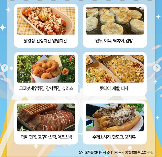 먹거리존에는 닭강정, 간장치킨, 양념치킨, 만두, 어묵, 떡볶이, 김밥, 코코넛 새우튀김, 감자튀김, 츄러스, 팟타이, 케밥, 피자, 족발, 편육, 고구마스틱, 어포스낵, 수제 소시지, 핫도그, 꼬치류가 판매될 예정입니다.