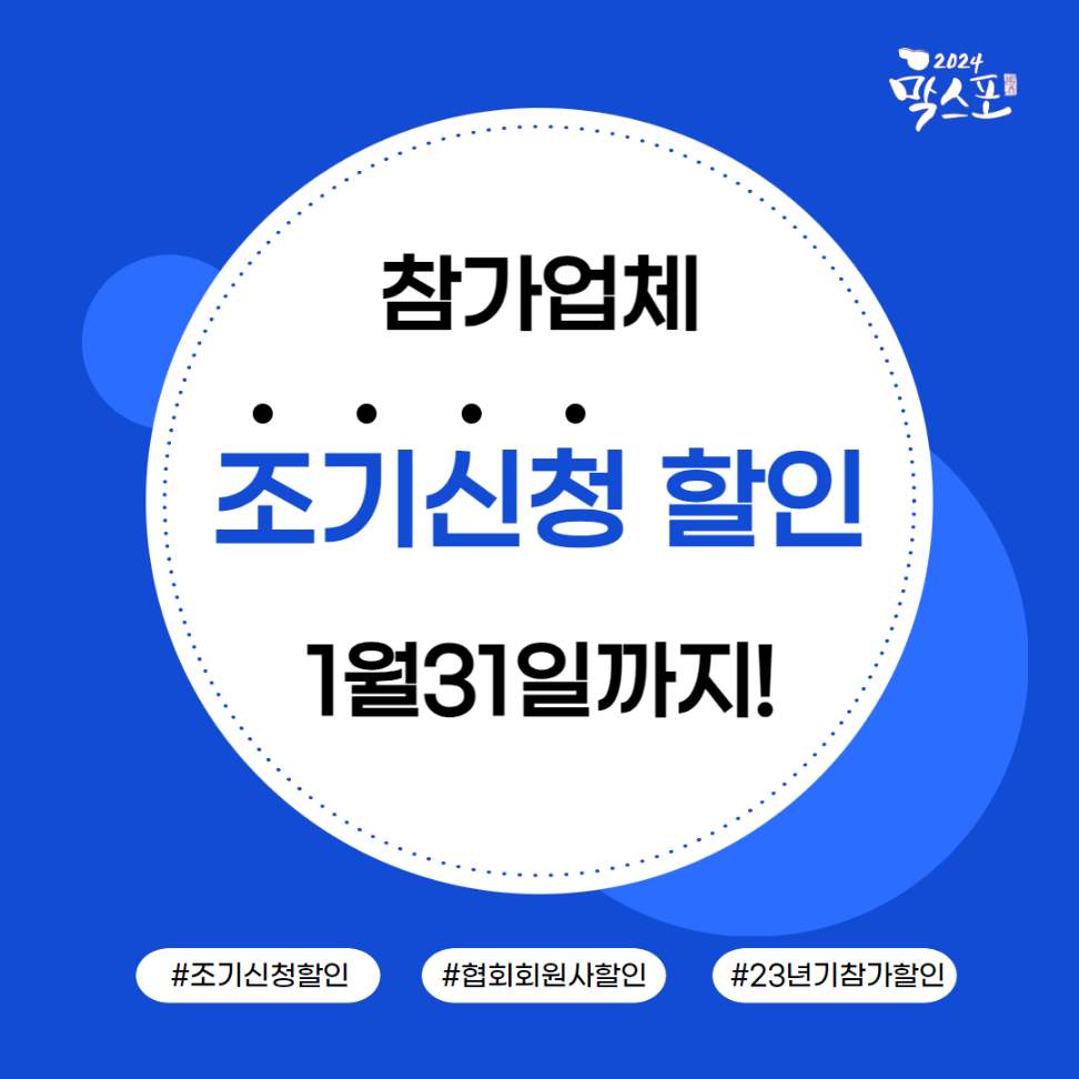 1월 31일까지 조기 신청시 부스당 20만 원 할인되고 막걸리 협회 회원사의 경우 부스당 30만 원 할인, 2023 막스포 기참가 업체의 경우 부스당 10만 원 할인됩니다. (최대 50만 원까지 할인 적용 가능)