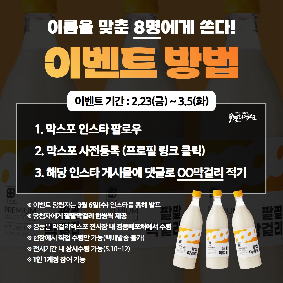 이벤트 당첨자는 3.6(수) 인스타를 통해 발표합니다. 당첨자 8명에게는 팔팔막걸리 한 병씩을 제공합니다. 경품은 막걸리 엑스포 전시장 내 경품배포처에서 직접 수령 가능하며 택배는 불가합니다. 전시기간(5.10~12)내에 상시 수령 가능합니다.