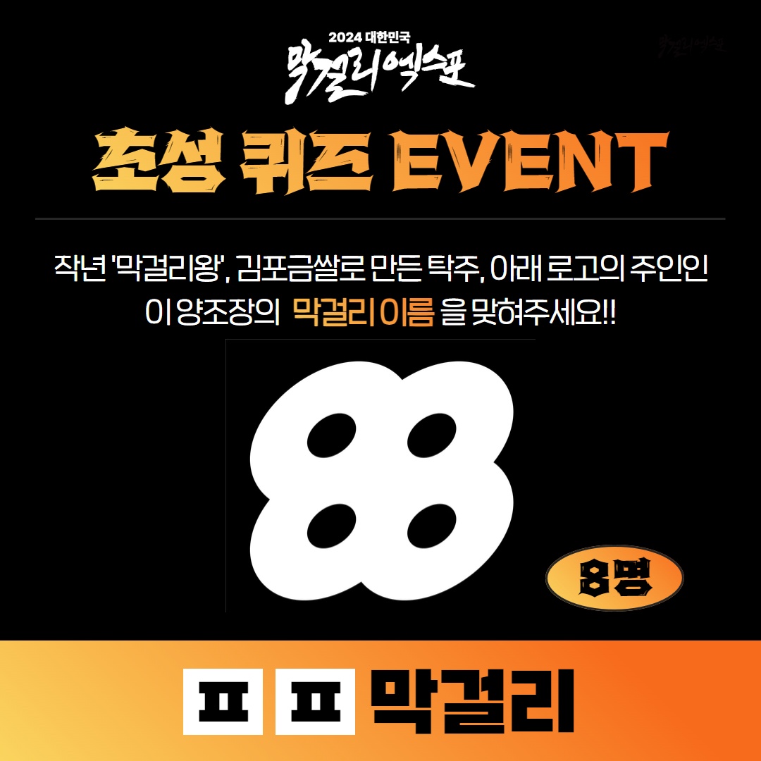 이벤트 당첨자는 3.6(수) 인스타를 통해 발표합니다. 당첨자 8명에게는 팔팔막걸리 한 병씩을 제공합니다. 경품은 막걸리 엑스포 전시장 내 경품배포처에서 직접 수령 가능하며 택배는 불가합니다. 전시기간(5.10~12)내에 상시 수령 가능합니다.