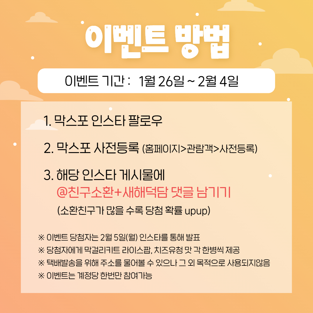 오늘은 막스포에서 진행중인 설날 이벤트 소식 전해드렸어요. 글 작성하고 저도 당장 이벤트 참여하러 가야겠습니다. 친구에게 새해 덕담도 남기고 막걸리키트도 받고 1석 2조니까요!