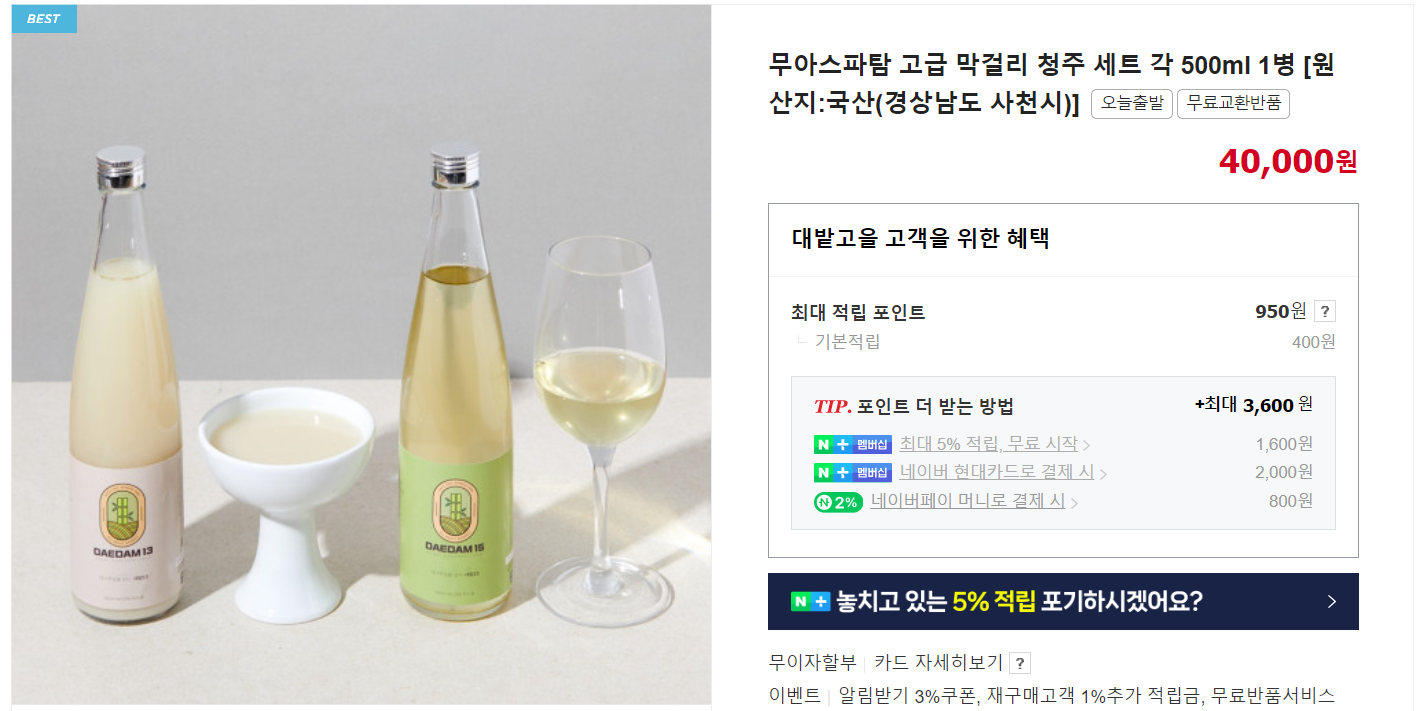대밭고을 영농조합법인의 막걸리와 약주 세트입니다. 대나무가 들어가서 시원하고 깔끔한 맛이 매력적인 술인데요. 사실 이 술은 제가 명절 픽으로 담아놓은 술이랍니다. 막걸리는 설에 마시고 약주는 정월대보름에 마실까 생각 중입니다. 현재 500ml 세트 구성이 38,000원에 할인 행사 중이네요.