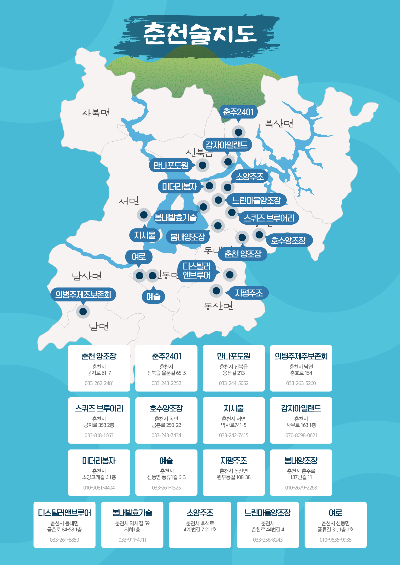 춘천에는 전통주 양조장이 생각보다 훨씬 많이 있습니다. 우리가 가장 잘 아는 지평주조부터 느린 마을 양조장, 춘천 양조장, 감자 아일랜드, 예술, 호수 양조장 등 다양한 양조장이 있는데요. 춘천 술 페스타에서는 이 양조장의 술들을 모두 만나볼 수 있답니다. 위의 춘천 술 지도를 참고해 주세요!
