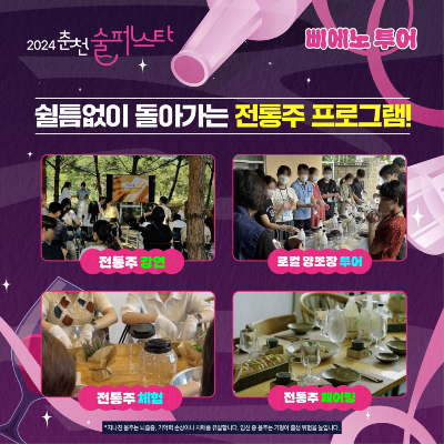 2024년 9월 6일, 7일 이틀 간 KT&G상상마당 춘천에서 열리며, 춘천시 소재 양조장이 참여합니다. 춘천 술 페스타 행사장에서는 춘천에서 만드는 다양한 술을 만나볼 수 있으며 증류주, 탁주, 맥주, 지역특산주, 과실주, 약주를 취향에 따라 모두 맛보고 즐길 수 있습니다. 더불어 전통주와 어울리는 로컬 먹거리와 다양한 체험 프로그램 등이 진행됩니다.