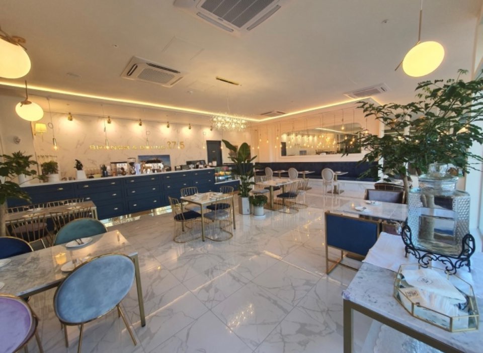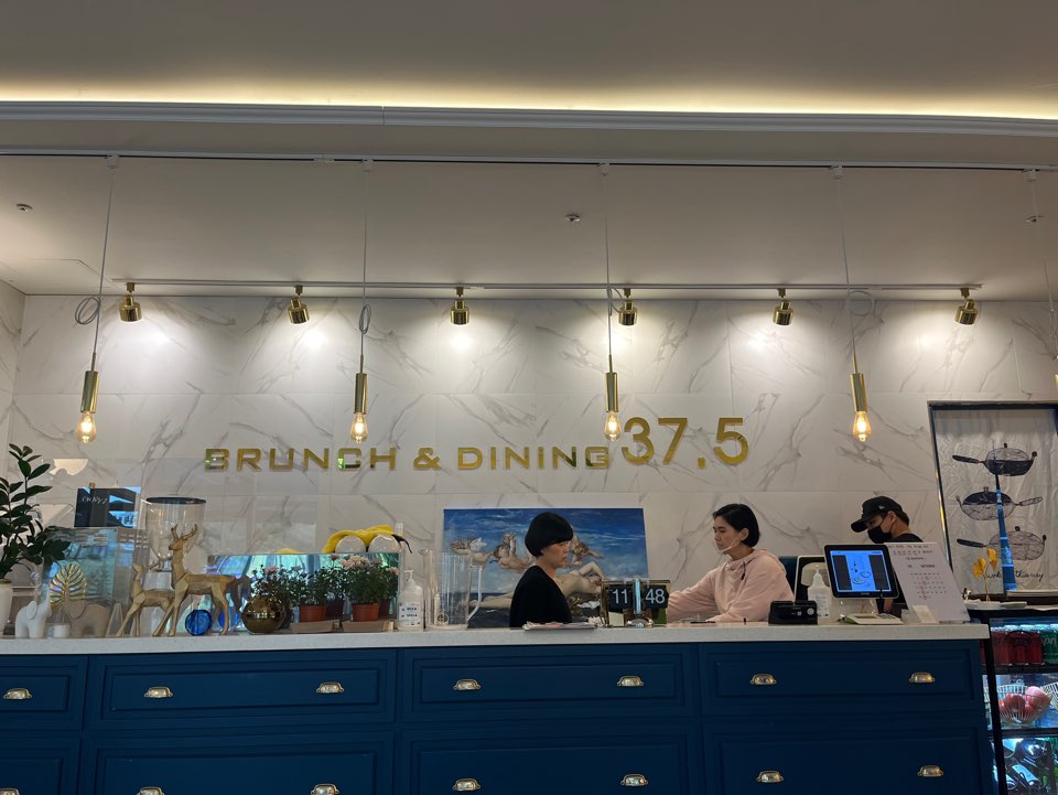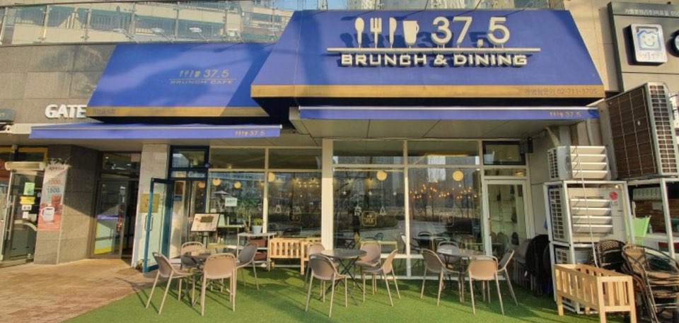 3번 게이트로 나오면 왼쪽에 파란 간판의 37.5를 만날 수 있어요. 테라스석이 서너 테이블 있는데 제가 방문했을 때에는 날씨가 좋았던 터라 이미 테라스석은 만석이었어요. 내부에는 4인석 테이블이 10개 정도 있었던 것 같습니다. 인테리어가 고급스럽고 예뻐요.
