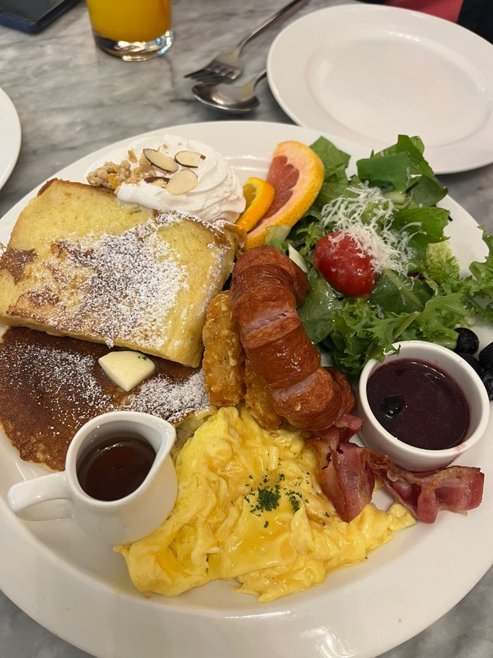 좌측부터 정통 미국식 브런치(17,900원), 철판 토마토 오믈렛(17,900원)치킨텐터와 감자튀김(9천 원대)입니다. 정통 미국식 브런치는 스크램블 에그, 소시지, 샐러드, 프렌치토스트, 팬케이크, 해시브라운으로 구성되어 있어요. 조금씩 다양하게 맛보고 싶어서 시켰는데 하나하나 다 맛있었습니다.