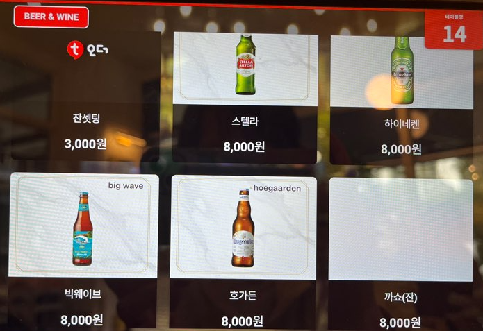 37.5의 장점 중에 하나는 다양한 주류가 있다는 것입니다. 맥주와 와인이 있는데 병맥주로 스텔라, 하이네켄, 빅웨이브, 호가든이 있습니다. 와인은 글라스와인 두 종류(까쇼/샤도네이)와 병와인 두 종류(까쇼/샤도네이)가 준비되어 있습니다.
