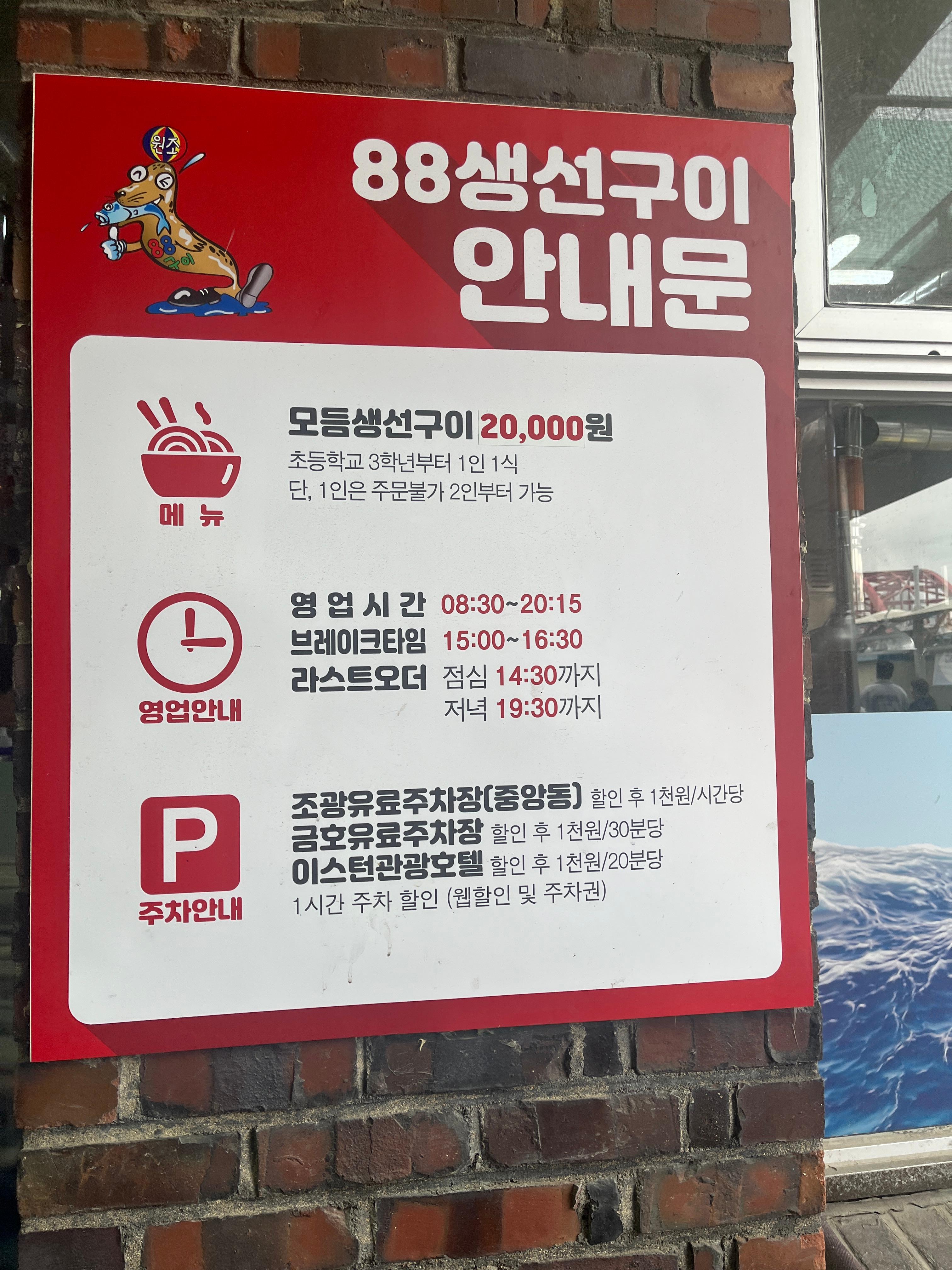 속초 중앙동에 위치한 88생선구이는 아침 8시 30분부터 저녁 8시 15분까지 운영되는 숯불 생선구이집입니다. 모듬 생선구이(20,000원) 단일 메뉴이며 초등학교 3학년 이상은 1인 1메뉴 주문이 필수예요.