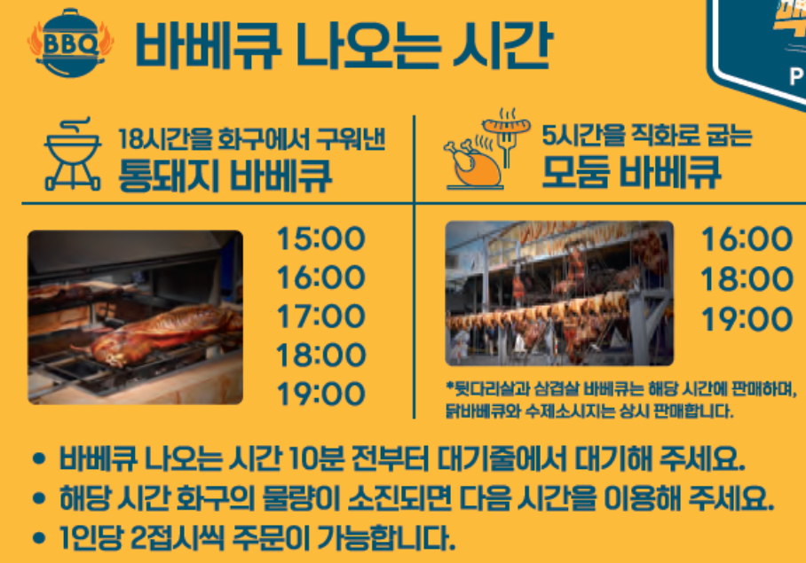 18시간을 화구에서 구워낸 통돼지 바베큐와 5시간을 직화로 굽는 모둠 바베큐가 있습니다. 가격은 아래 사진을 참고해 주시고요. 바베큐 나오는 시간이 정해져 있으니 그 시간 10분 전부터 대기줄에서 대기하여 구매하시면 됩니다. 1인 2 접시씩 주문 가능하다고 합니다.