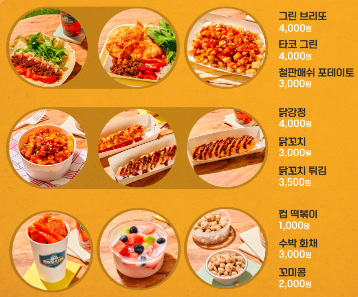 바베큐 이외에 브리또, 닭강정, 닭꼬치, 타코, 떡볶이, 화채 등 다양한 스낵류가 저렴한 가격에 준비되어 있습니다.