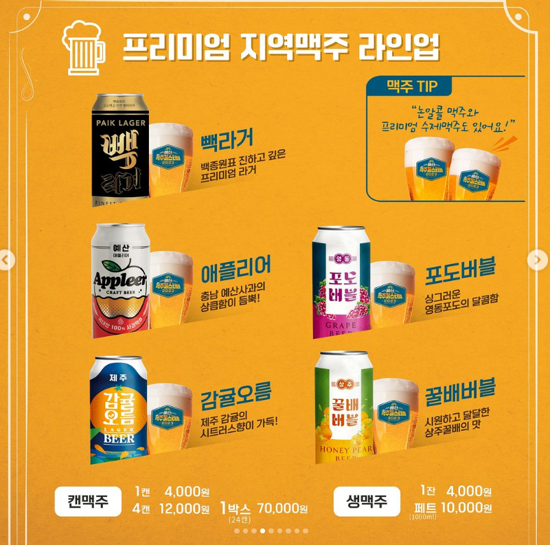 캔맥주와 생맥주가 있으며 논알코올 맥주도 준비되어 있습니다. 캔맥주는 1캔 4,000원 / 4캔 12,000원 / 1박스(24캔) 70,000원에 판매합니다. 생맥주는 1잔 4,000원, 페트(1L)는 10,000원에 판매한다고 하니 가성비 축제 맞는 것 같습니다. 라인업은 아래를 참고해 주세요!