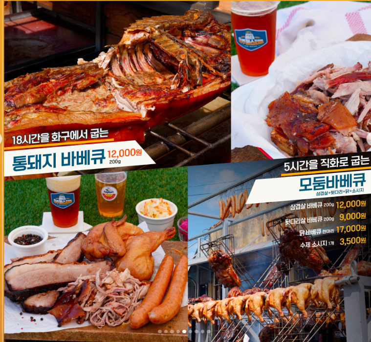 18시간을 화구에서 구워낸 통돼지 바베큐와 5시간을 직화로 굽는 모둠 바베큐가 있습니다. 가격은 아래 사진을 참고해 주시고요. 바베큐 나오는 시간이 정해져 있으니 그 시간 10분 전부터 대기줄에서 대기하여 구매하시면 됩니다. 1인 2 접시씩 주문 가능하다고 합니다.