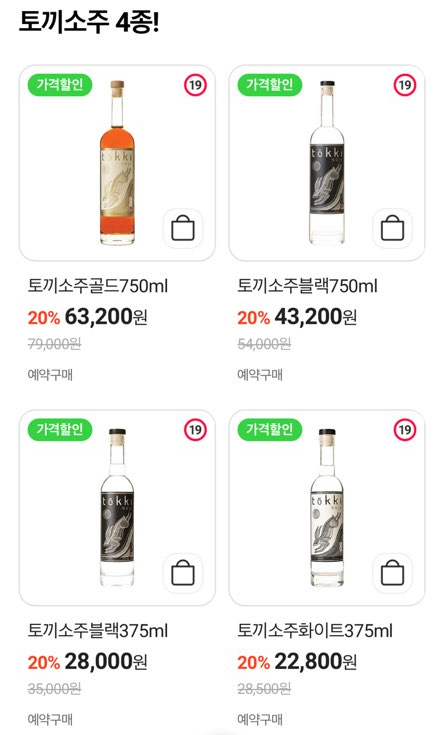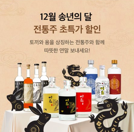 올해가 토끼의 해였고 내년이 용의 해잖아요. 그래서 현재 CU편의점 앱인 포켓 CU에서 토끼와 용을 상징하는 전통주들을 초특가 할인 중입니다. 추가로 고구마소주로 유명한 술아원의 필 소주 2종도 함께 할인행사 중이네요. 토끼 소주는 20%나 할인을 하고 있는데요. 이번 행사 기간에 저도 구매하려고요.